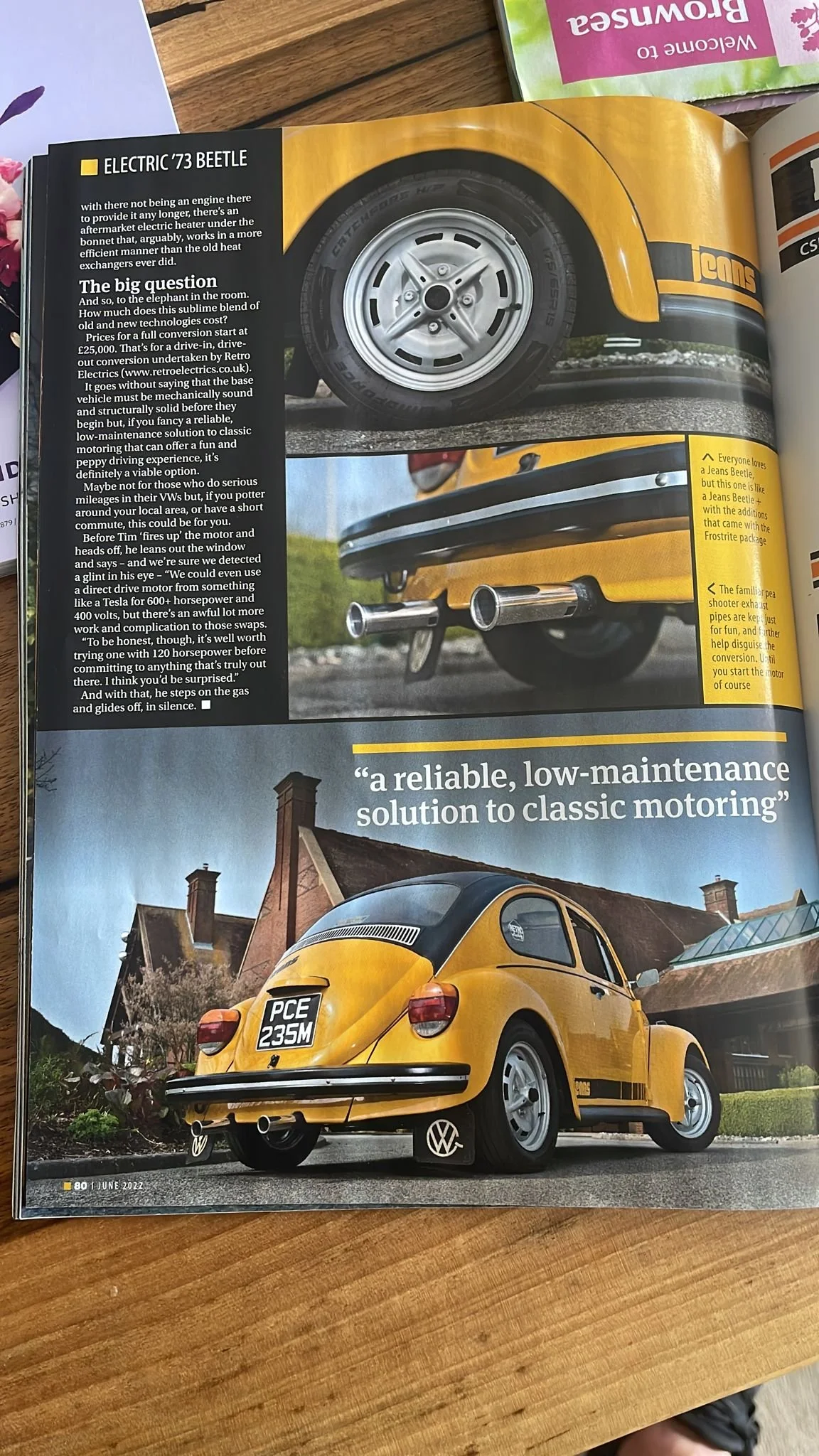 And so the very rare 1974 Jeans Beetle was purchased with a view to it being returned to its pomp but with electric power and performance. After much research Retroelectrics were selected to undertake all the high voltage work. Following completion of both the restoration and electric conversion, the car was featured at the 2022 Volksworld show at Sandown Park and followed this with a five-page feature in July 2022 edition of the Volksworld magazine.